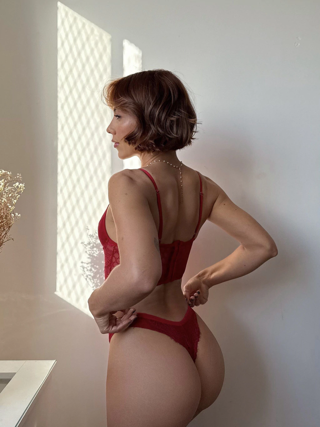 Além do corselete, o conjunto acompanha uma calcinha feita com os mesmos materiais finos, completando o visual com charme e harmonia.